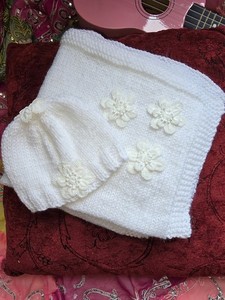 Baby Blanket Bonnet Set White Hand Knit Artisan Gift Christening Birth Gift