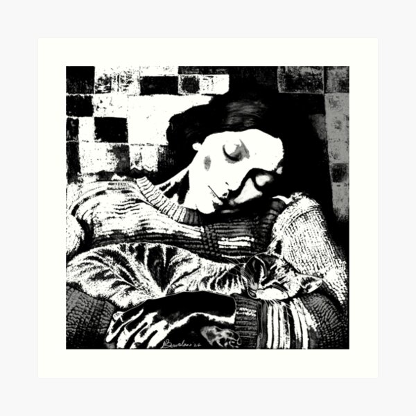 Me and Cat Sleeping in Winter Monochrome Art by iServalan for Tale Teller Club Art Print