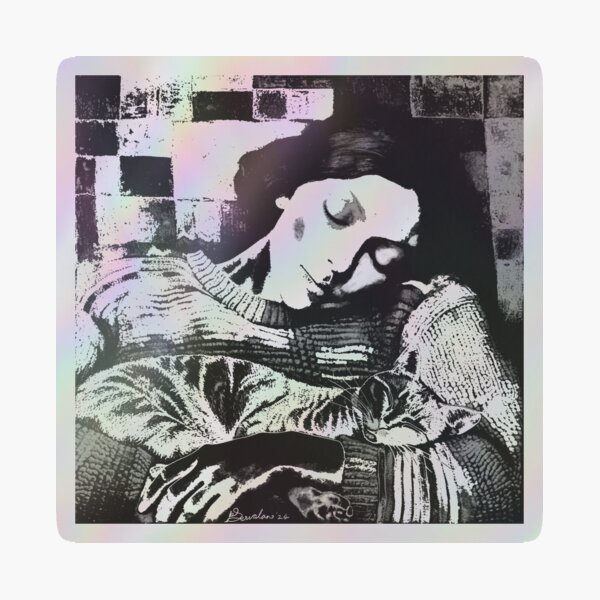 Me and Cat Sleeping in Winter Monochrome Art by iServalan for Tale Teller Club Holographic Sticker